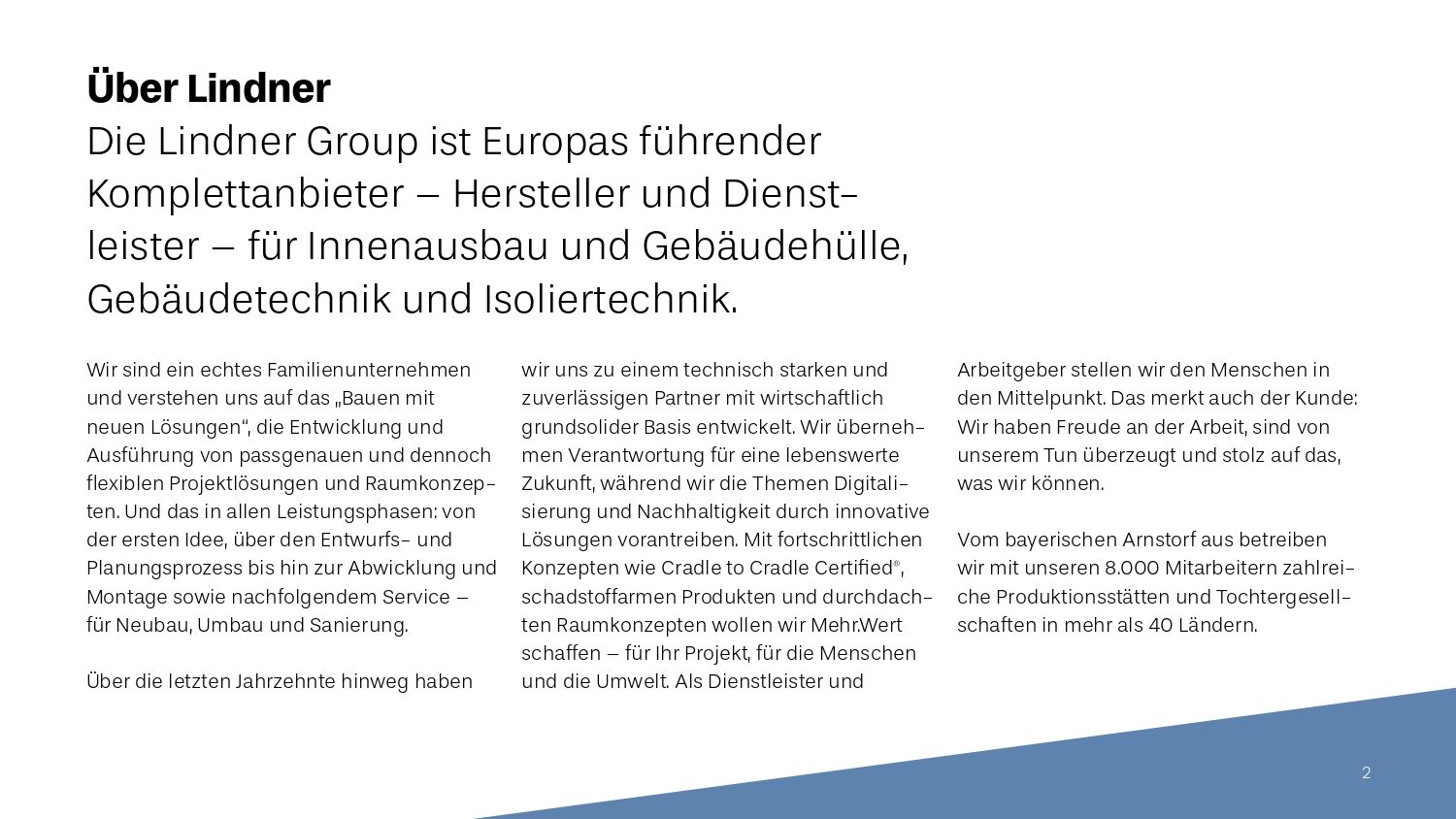 Die Lindner Group ist Europas führender Komplettanbieter – Hersteller und Dienstleister – für Innenausbau, Gebäudehülle, Gebäudetechnik und Isoliertechnik.